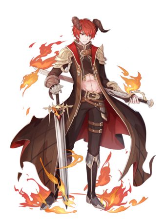 Rogue is a well-built man who stands at a height of 6'3. He has a light tan, and possesses short red spiked hair. Rogue's most striking features are his crimson eyes, and the horns atop his head. These horns are dark reddish brown in colour, and point forward with a slight curve, sitting about forehead-height at their end. He has several scars from previous battles, but most of these are beneath his clothes. His most distinguished one stretches across the back of his shoulder blades, sustained in a fight when he was 18 years old.